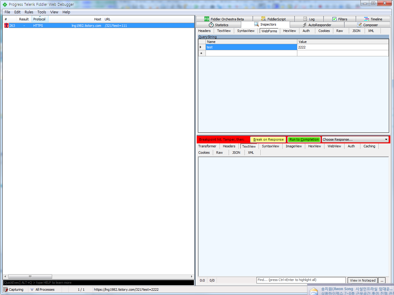 2. 브라우저에서 https://lng1982.tistory.com/321?test=111 호출