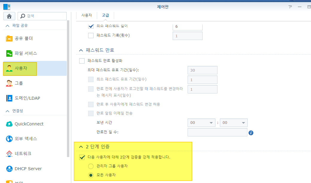 제어판 > 사용자 > 고급으로 이동하여 2단계 인증을 활성화 한다.