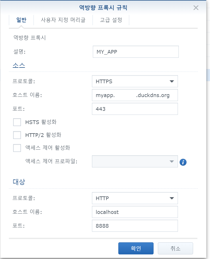 주제 대체 이름 : 역방향 프록시 규칙에 추가한 웹 애플리케이션의 4차 도메인 정보를 추가해 준다. (myapp.xxx.duckdns.org;myapp2.xxx.duckdns.org; 세미콜론 구분자를 통해 여러개 등록 가능)