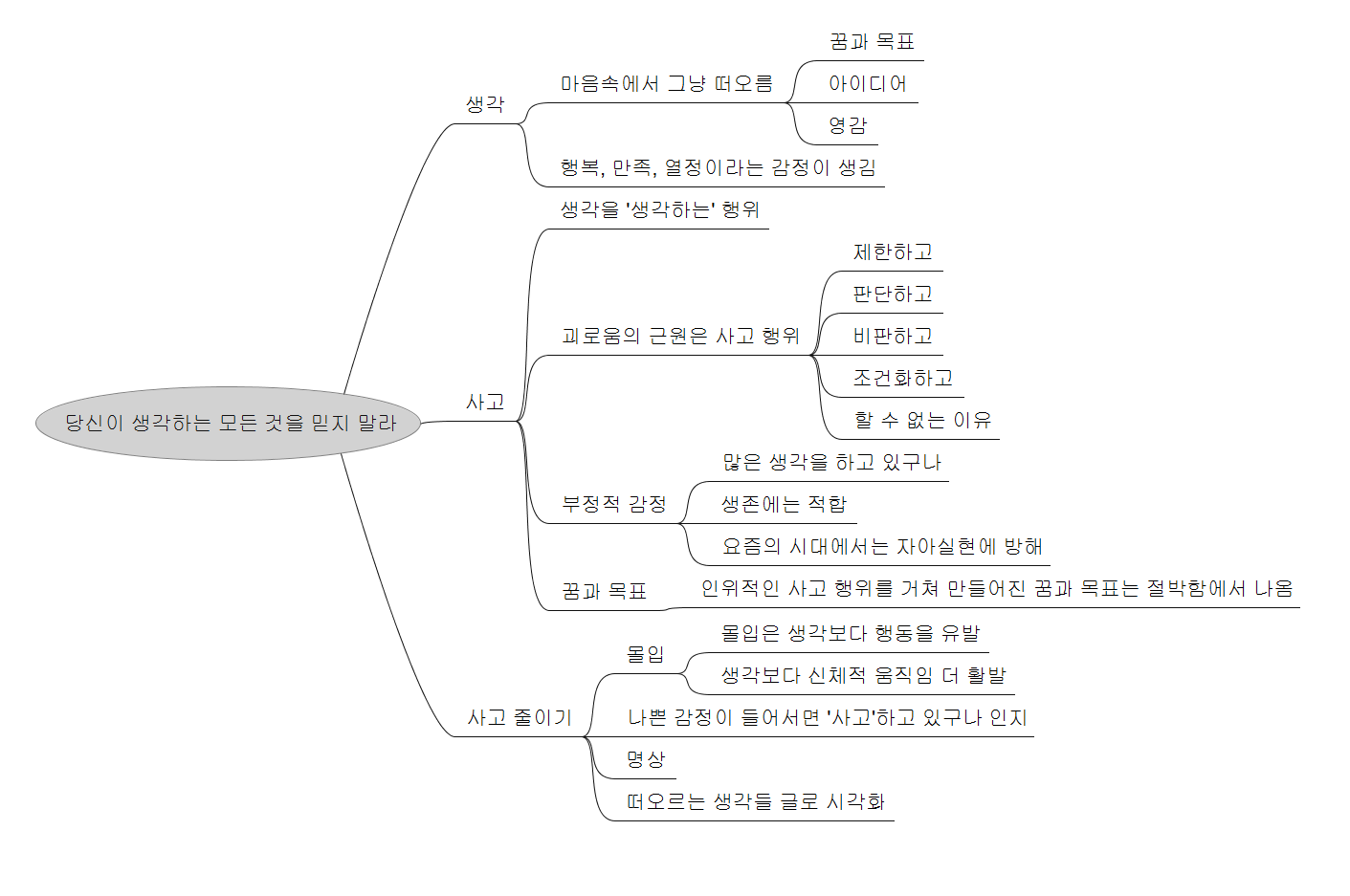 두 번째 카테고리는 '걱정' 을 유발하는 생각들이다. 발생 가능성이 전혀 없는 생각들, 내 꿈과 목표에 대한 불확실성과 불안감에 대한 생각들, 앞으로 ~하면 어쩌지? 등은 내 스스로를 파괴하는 생각들이다. 이러한 생각들은 저자가 말한 것과 같이 줄여나가야 한다. 불안감이나 괴로운 감정이 들 때 "내가 또 생각에 빠져있구나." 인지하고, 빨리 벗어나자.