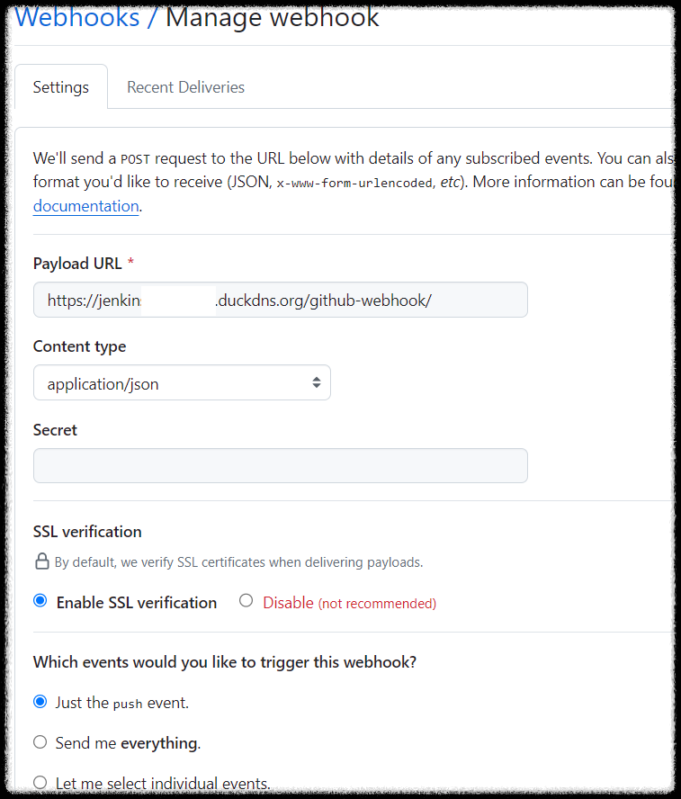 프로젝트 > Settings > Webhooks 설정에 들어가면 Payload URL을 입력할 수 있다.